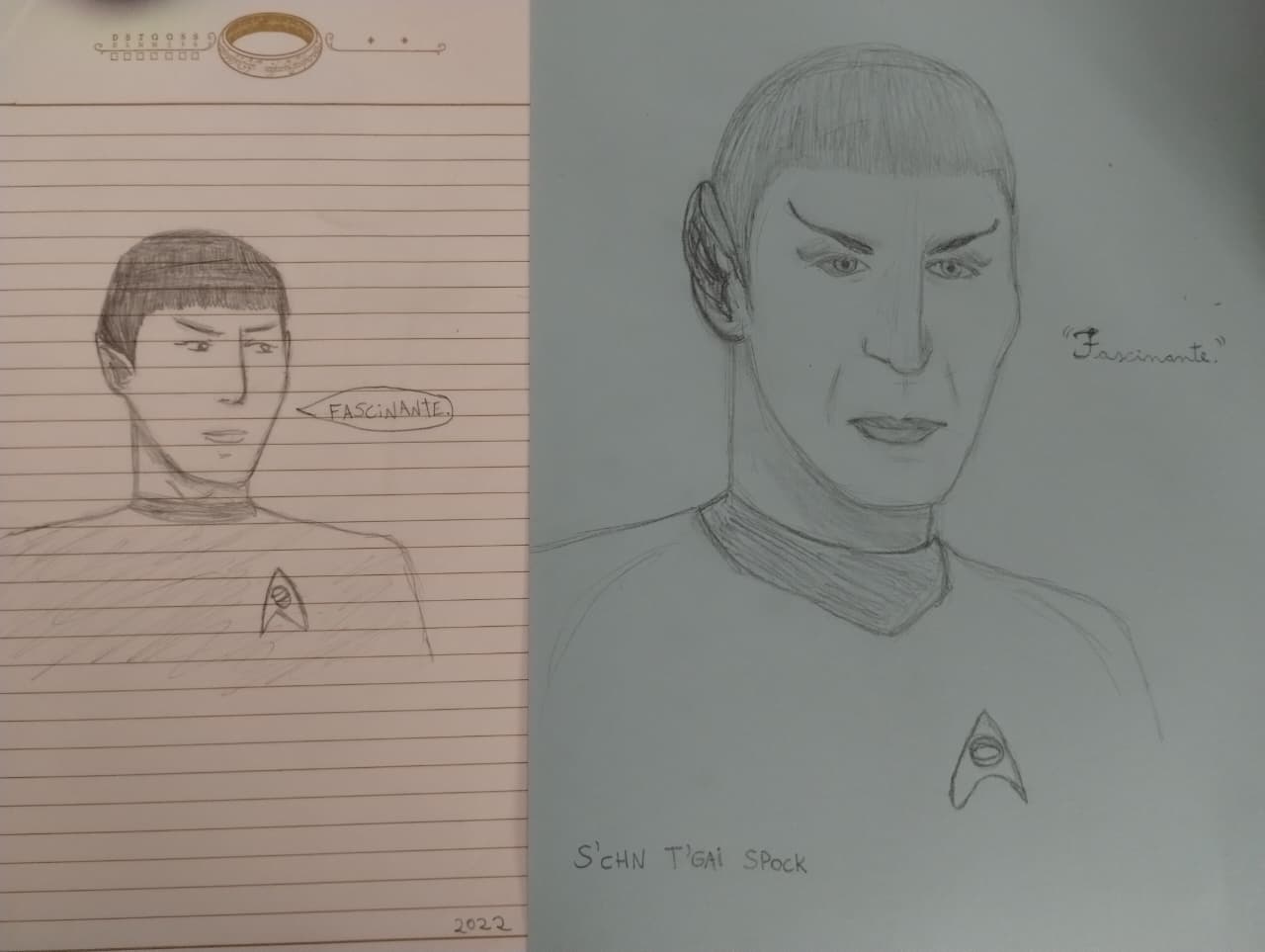 Date: 04-10-2025 Time: 17:00 Who said you need to write all of the day in only one entry? Like I'll truly use this frequently. I got interested in Star Trek in 2022 but didn't feel like watching TOS. Now I'm calmly watching the episodes and understanding them for real, even watching the brazilian dub instead of subtitled (the 70s portuguese sounds appealing...). Also, I made these drawings in 2022 and 2025: ![]() Mood: Happy bc ST Song: The Dead Dance - Lady Gaga Eating: Nothing, belly full :) |